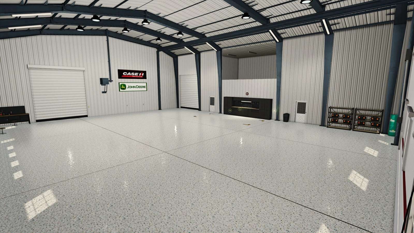 Here You can store grains, pallets and vehicles and them repair, sell or customize it. It has full lightning inside and outside manual