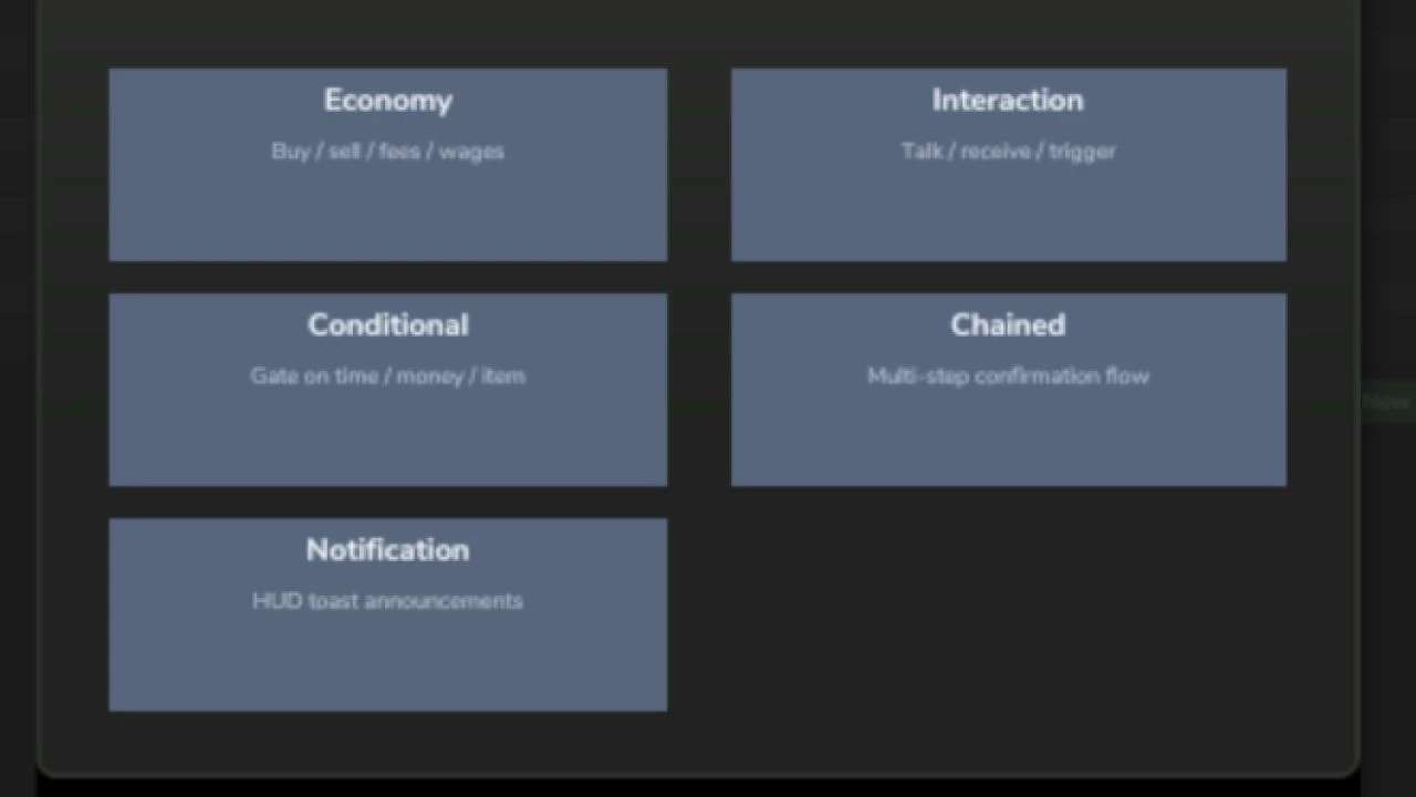 Using an easy step-by-step in-game wizard, you can create triggers for things like buying or selling items, paying fees, showing notifications, running events, or creating multi-step trigger chains. Everything is configured from a simple menu opened with F8.