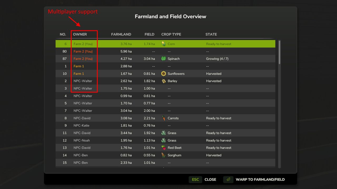 With this MOD you can quickly get an overview of all farmlands and fields. Your own fields are displayed first. You can also teleport directly to a farmland/field.