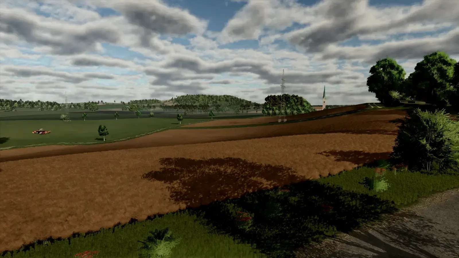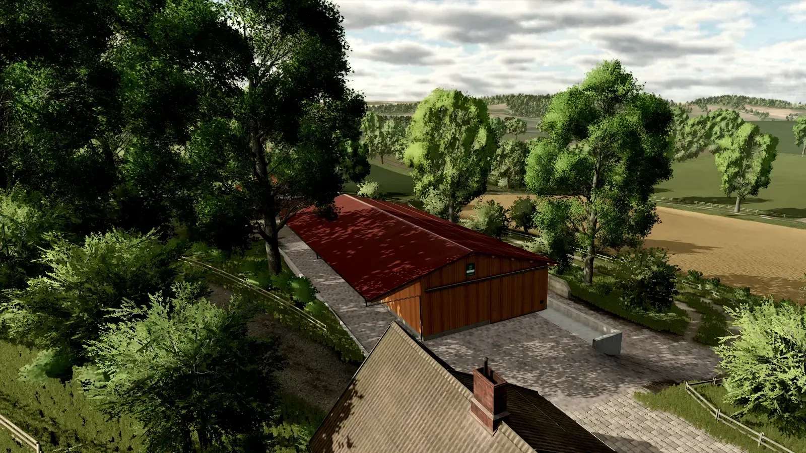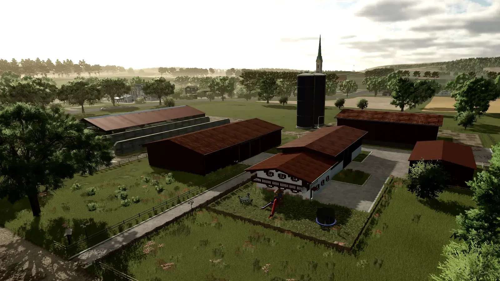 There are two free building plots and two completed farms with cows.