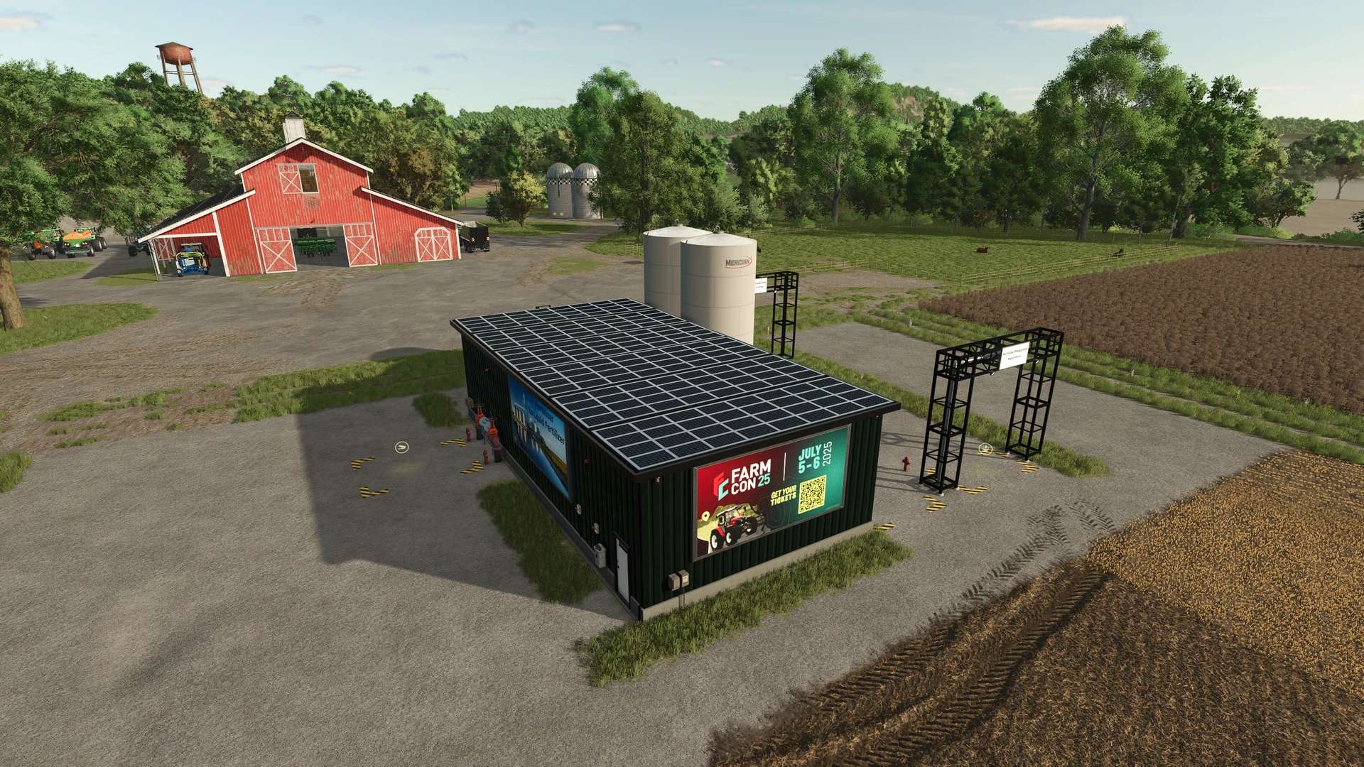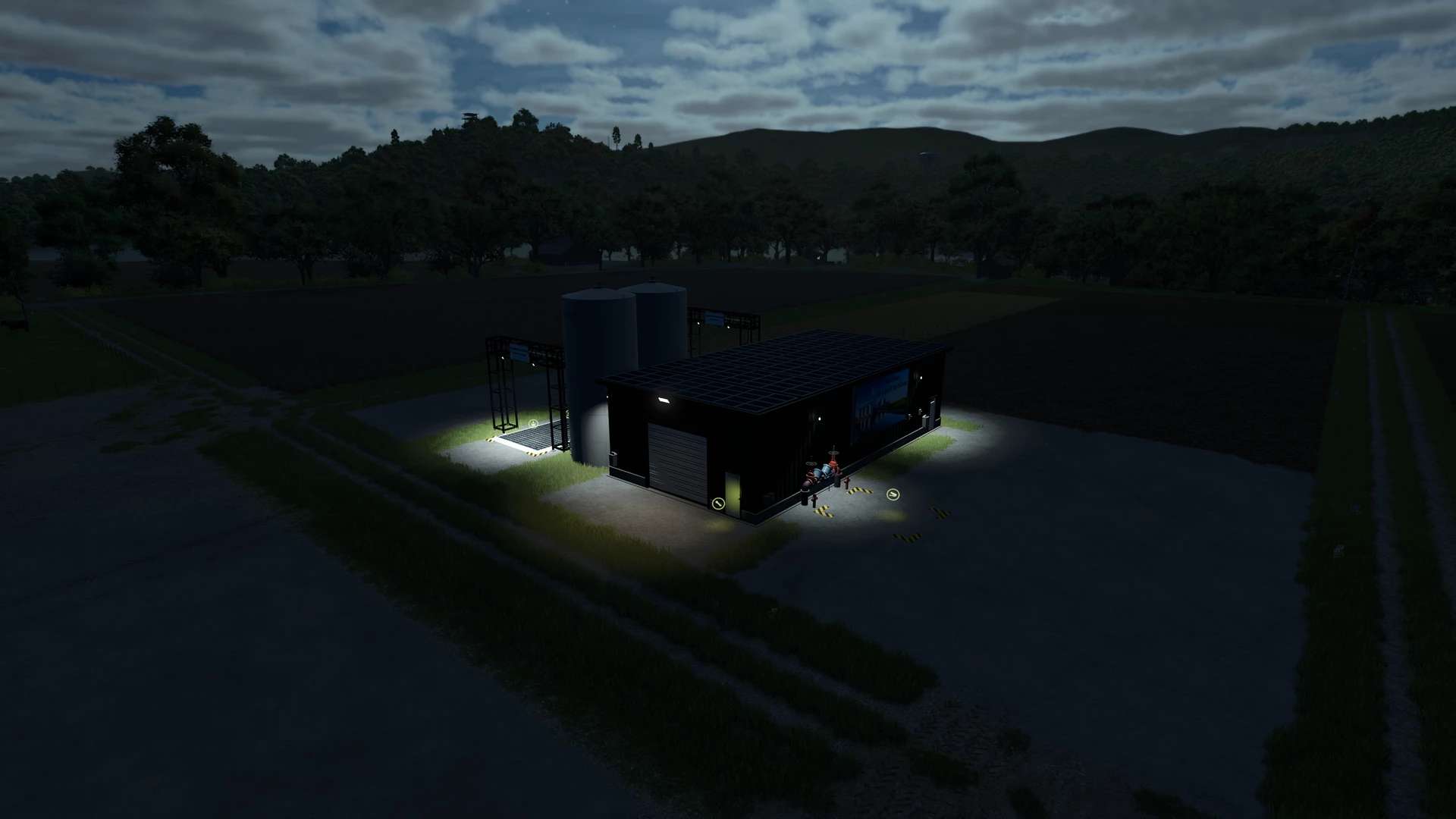 Solar cells can be installed on all buildings, and advertising boards can be installed on the larger buildings, generating passive income. Information boards can also be installed via configuration or hidden via a switch. The pallet spawner can be switched off in farm productions using a lever.
