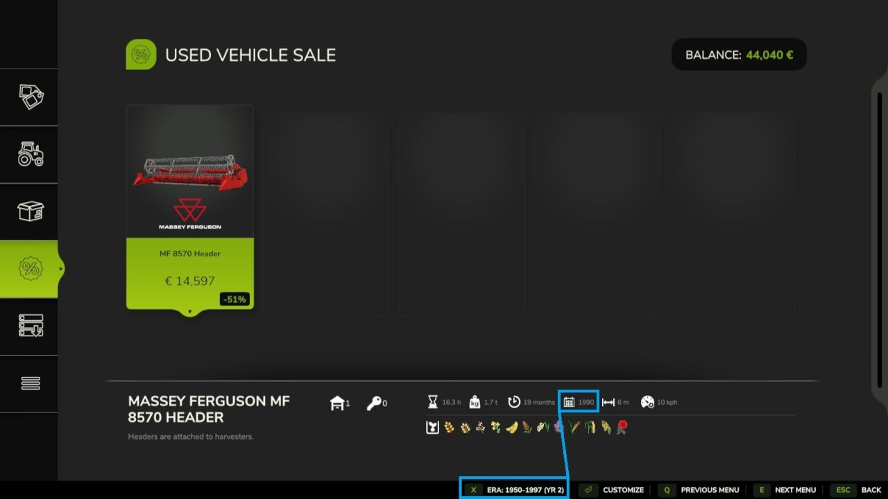 FilterYears restricts the Shop and Used Equipment markets to a specific era, which automatically progresses as your farm grows older. Start with the basics and unlock newer, more powerful technology with every passing in-game year.