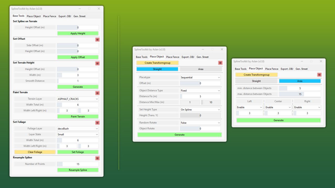 The SplineToolkit is a comprehensive GIANTS Editor script that brings a wide range of spline-related tools together in a single package. Nearly all functions include a real-time preview directly in the editor viewport.