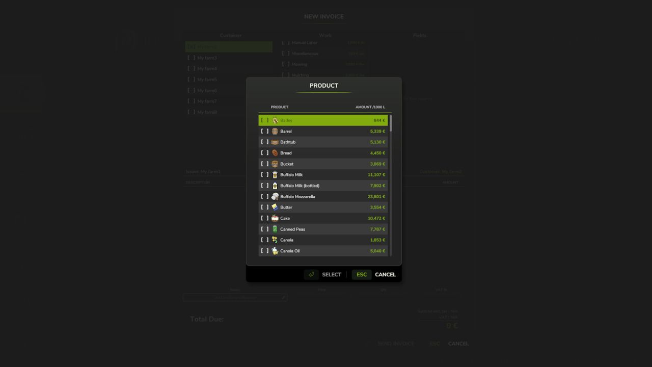Important: Only consumables physically present in the world (not stored inside buildings) can be invoiced and transferred. Make sure to eject bales, pallets or bigbags from storage buildings before creating an invoice.