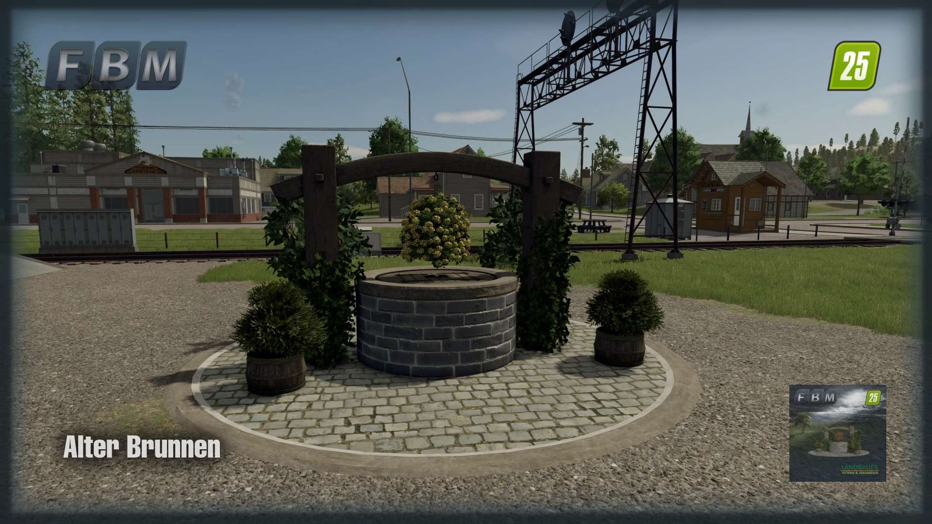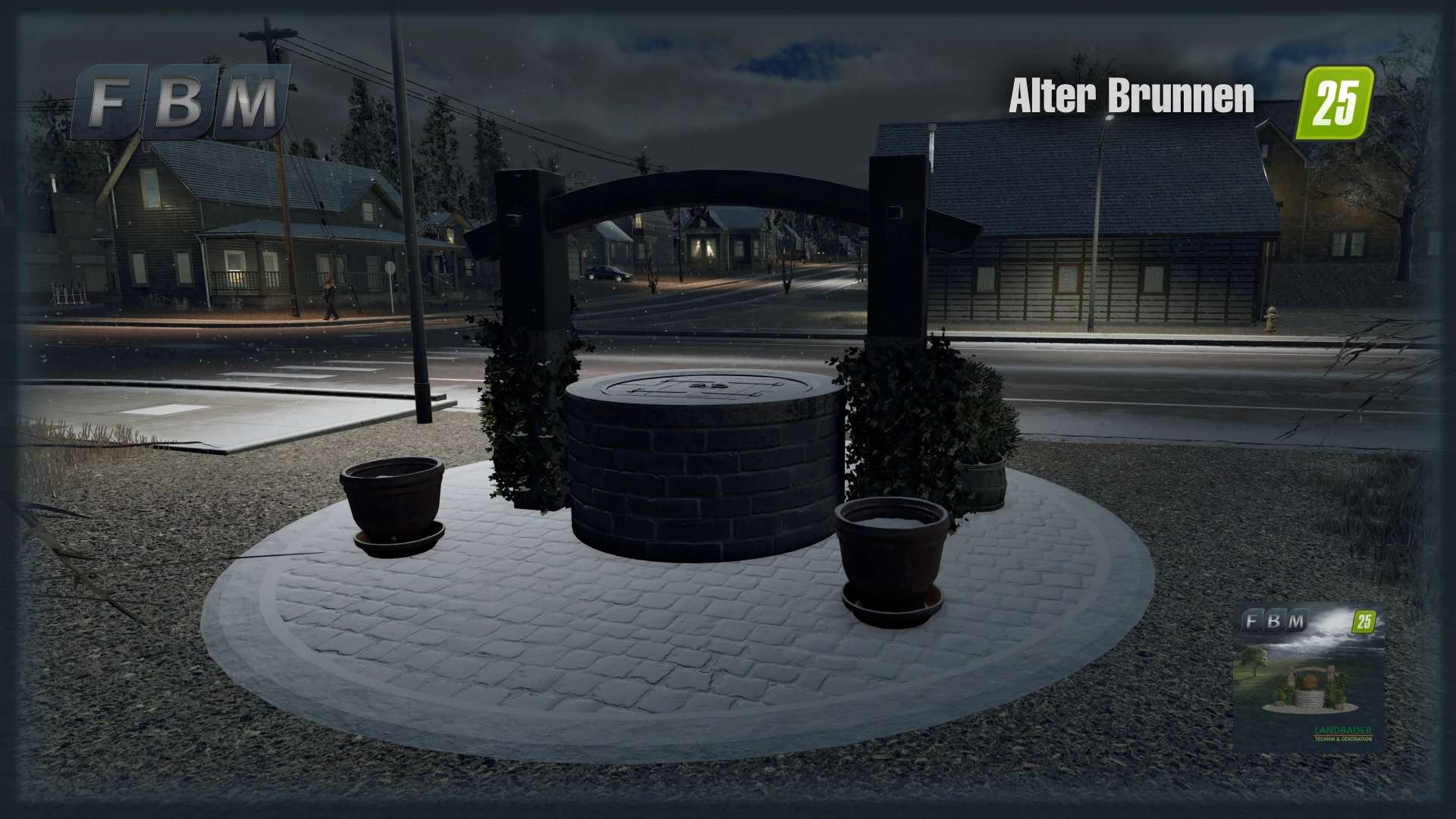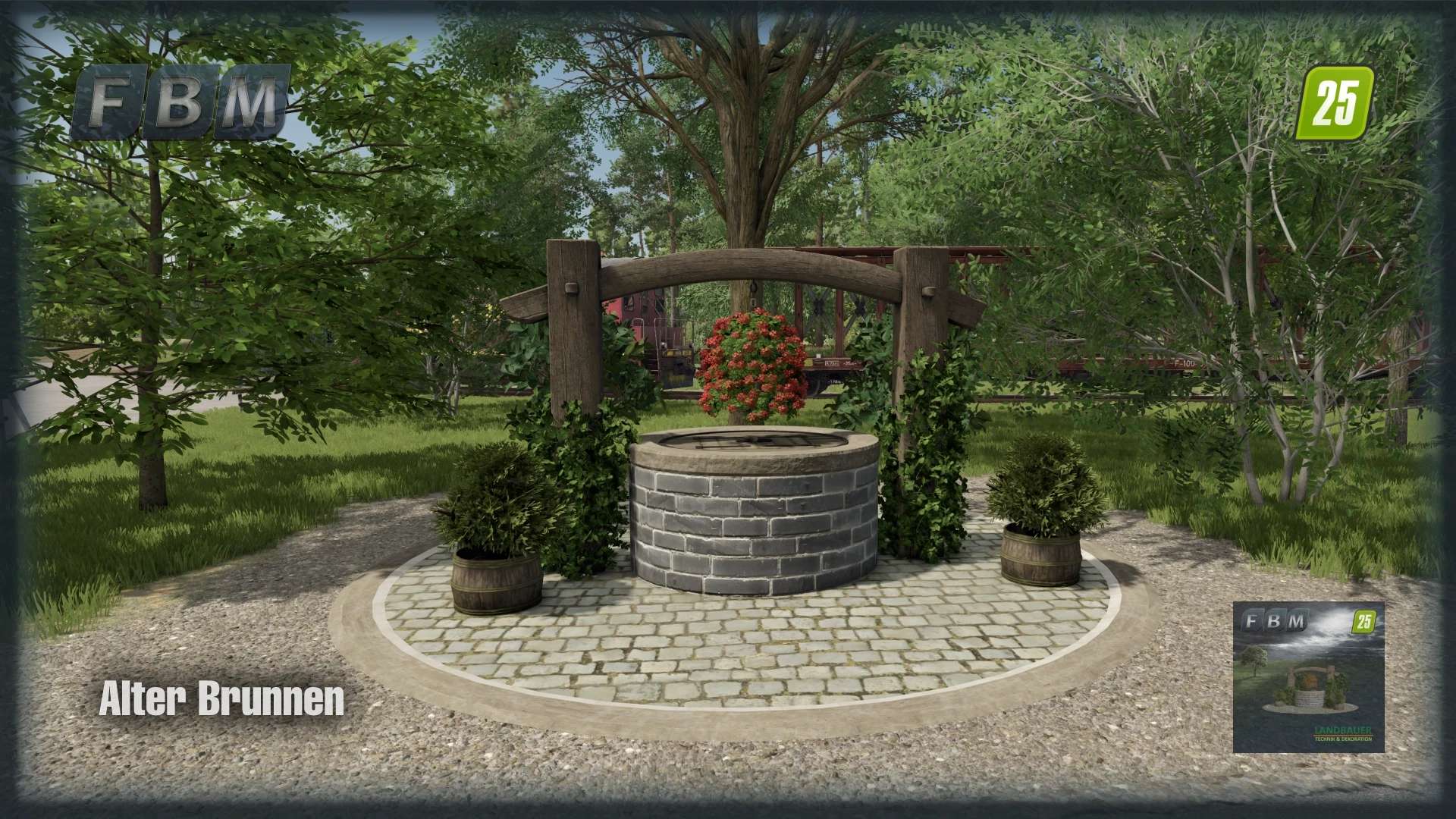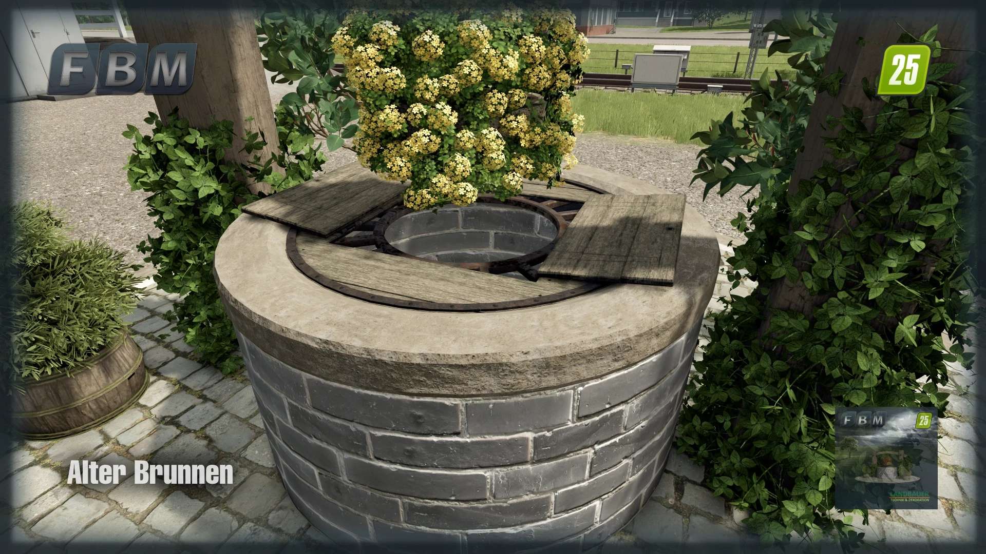 A restored old well with many plants as a decorative focal point for the courtyard or village square. The plants are seasonal, meaning they are only visible during certain times of the year. The well itself has two small wooden doors on the cover plate that can be opened to fill the well with water. It is also ManureSystem compatible; simply drop the small hose into the well.