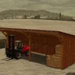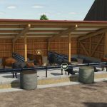This pack consists of two small, open buildings. One of them includes a cattle barn for livestock, and the other a shelter for equipment, pallets, etc., as well as a bulk bunker for storing manure or similar materials.