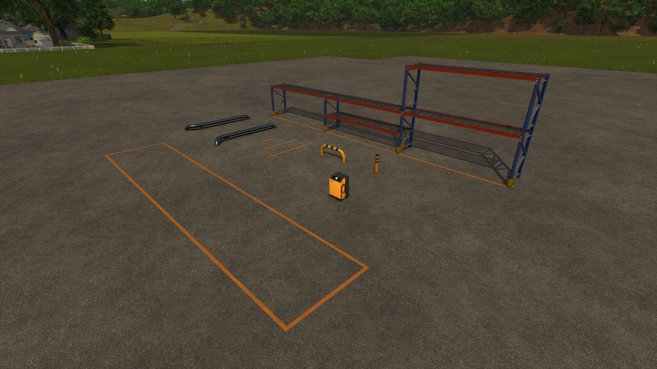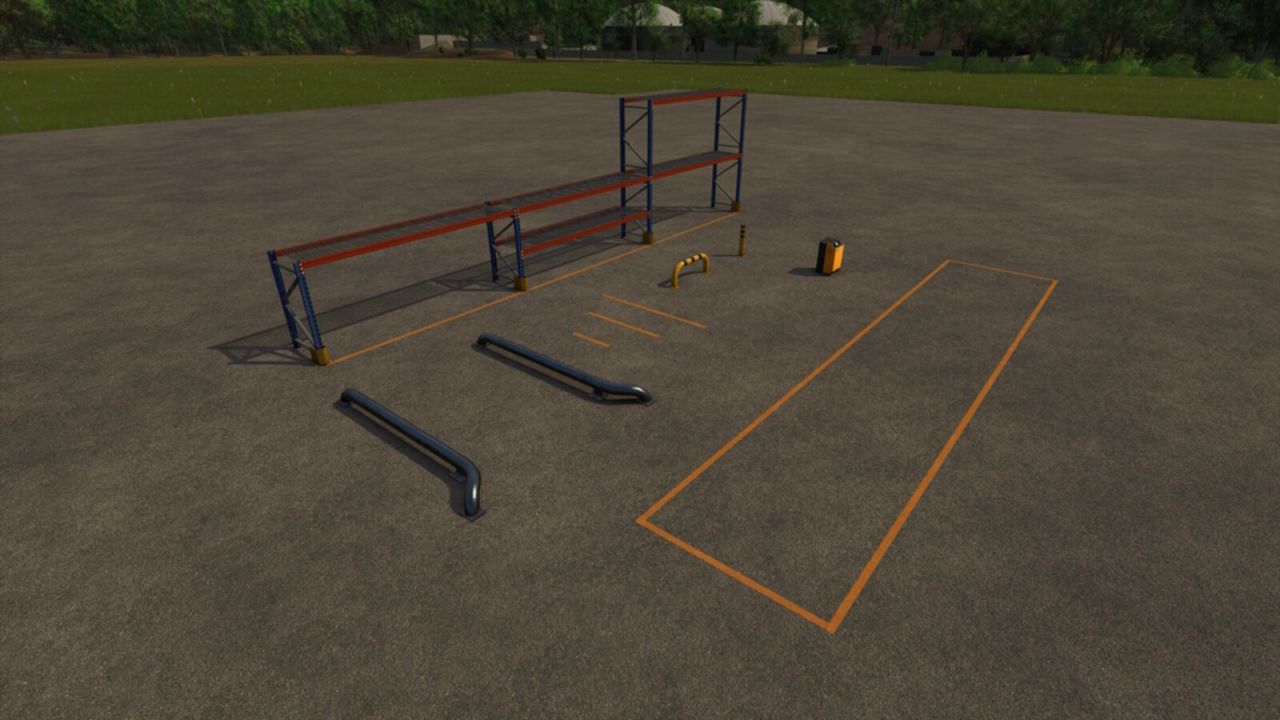This pack contains 2 models of safety bollads, 3 lengts of lines, a electric charging station and a construction kit of pallet racks.
