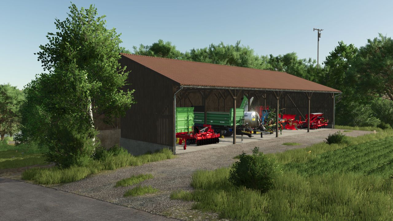 This building consists of a bunker silo and a slightly higher shelter for vehicles and machinery. The mod also includes a variant of the building where the actual bunker silo can be used as a wood chip storage.