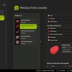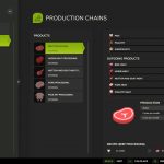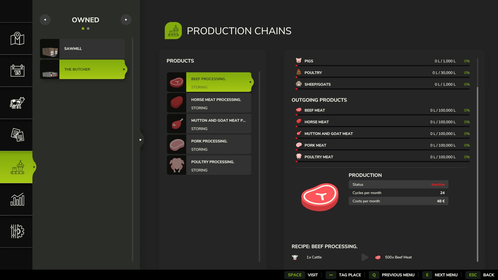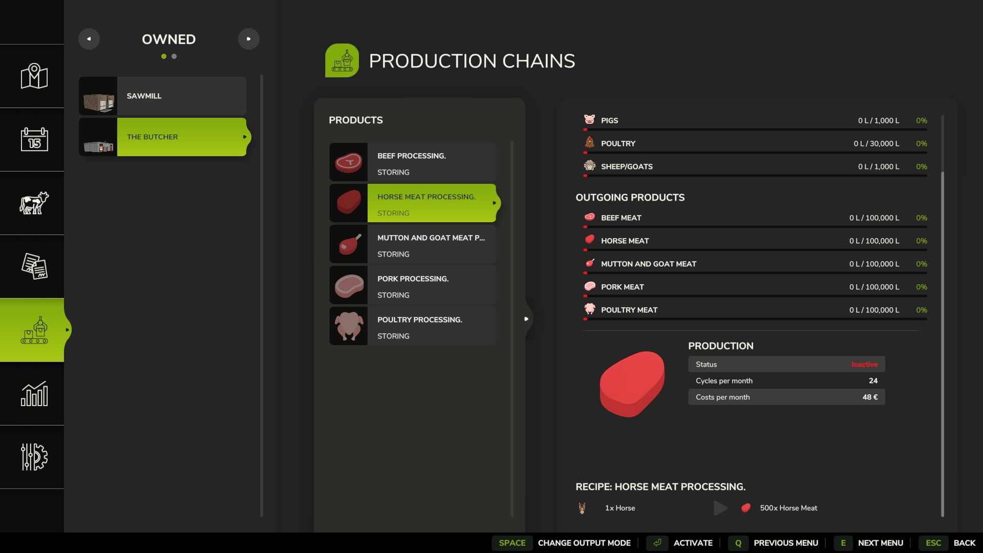 The butcher produces meat pallets from cows (buffalo not recommended), pigs, horse, chickens, and sheep/goats. Animal quantities are calculated at approximately 1 ton per pallet, with slaughter age based on gestation periods.