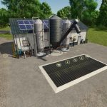 This is a production that has an internal storage for up to 2000 pallets. It will do 49 of the base game recipes, including a few from my other production mods. Once the production is actively making products, they will be spawned directly into the internal storage until you are ready for them. There is an unload and load area for both bulk material as well as pallets/bales to be stored. Bulk material can be stored and removed acting like a silo storage. There is a trigger next to the pallet spawn area to select what pallets to spawn and bulk material comes out of the silo pipe. When placing, there is an option for solar panels with a monthly ($720 monthly) income or no monthly income if you just like the look but don’t want the extra money. Bring whole trees or logs to the front of the building to process into wood chips for further processing.