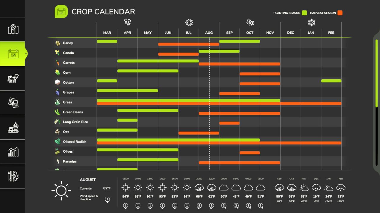 This map has custom weather patterns and a custom crop calendar to fit the area better. The custom crop calendar allows for harvesting two crops in one season if crop rotations are planned corretly.