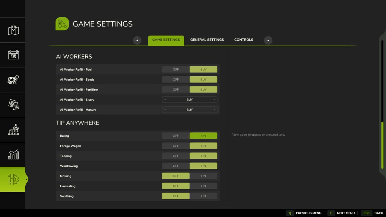 This mod allows all players to tip and shovel loose fill types anywhere on the map, including on NPC and unowned land. There are further settings in the general options page that allow bailers, tedders, windrowers, forage wagons and mowers to operate on unowned land. Optional field work permissions are also applied during contract missions.