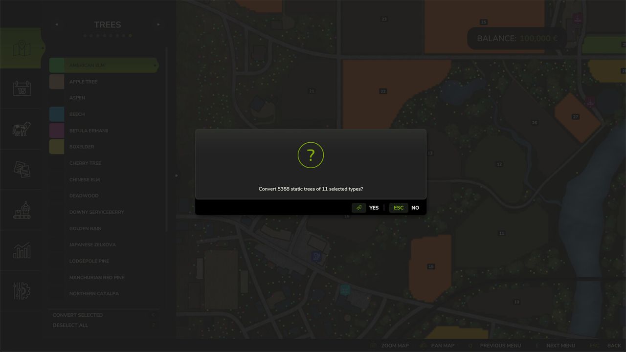 Usage: Open the in-game map and select “Trees” from the dropdown. Use the filter list to select tree types, then click “Convert Selected”.