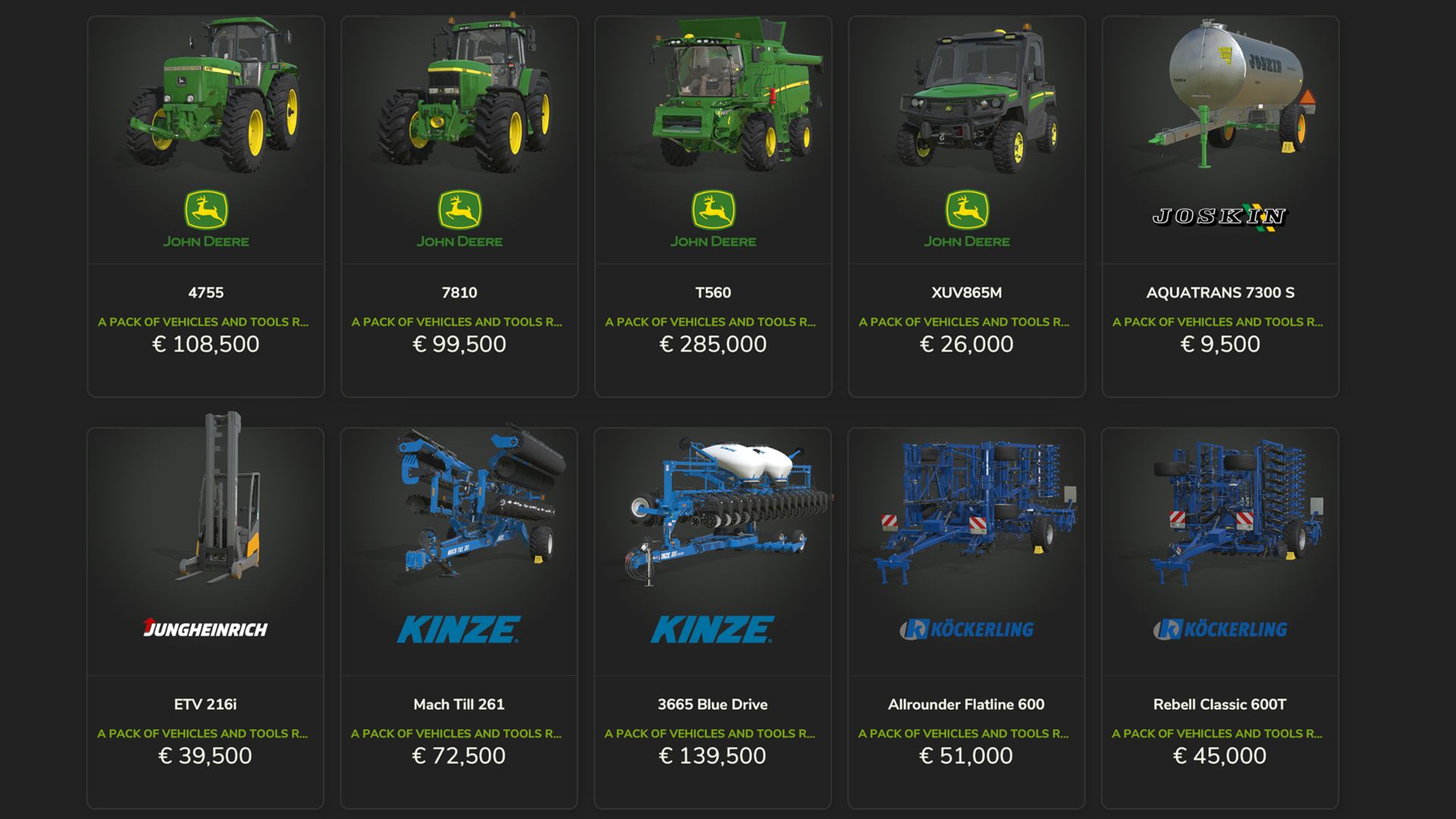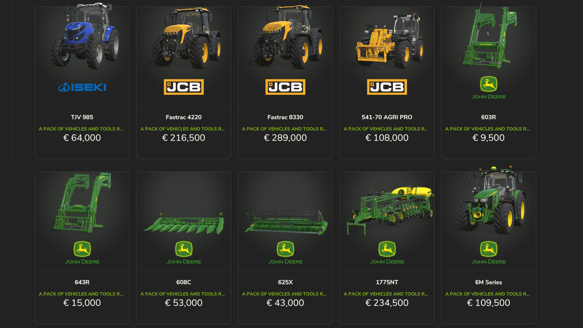 JohnDeere – frontloader603R, frontloader643R, header608C, header625X, planter1775NT
