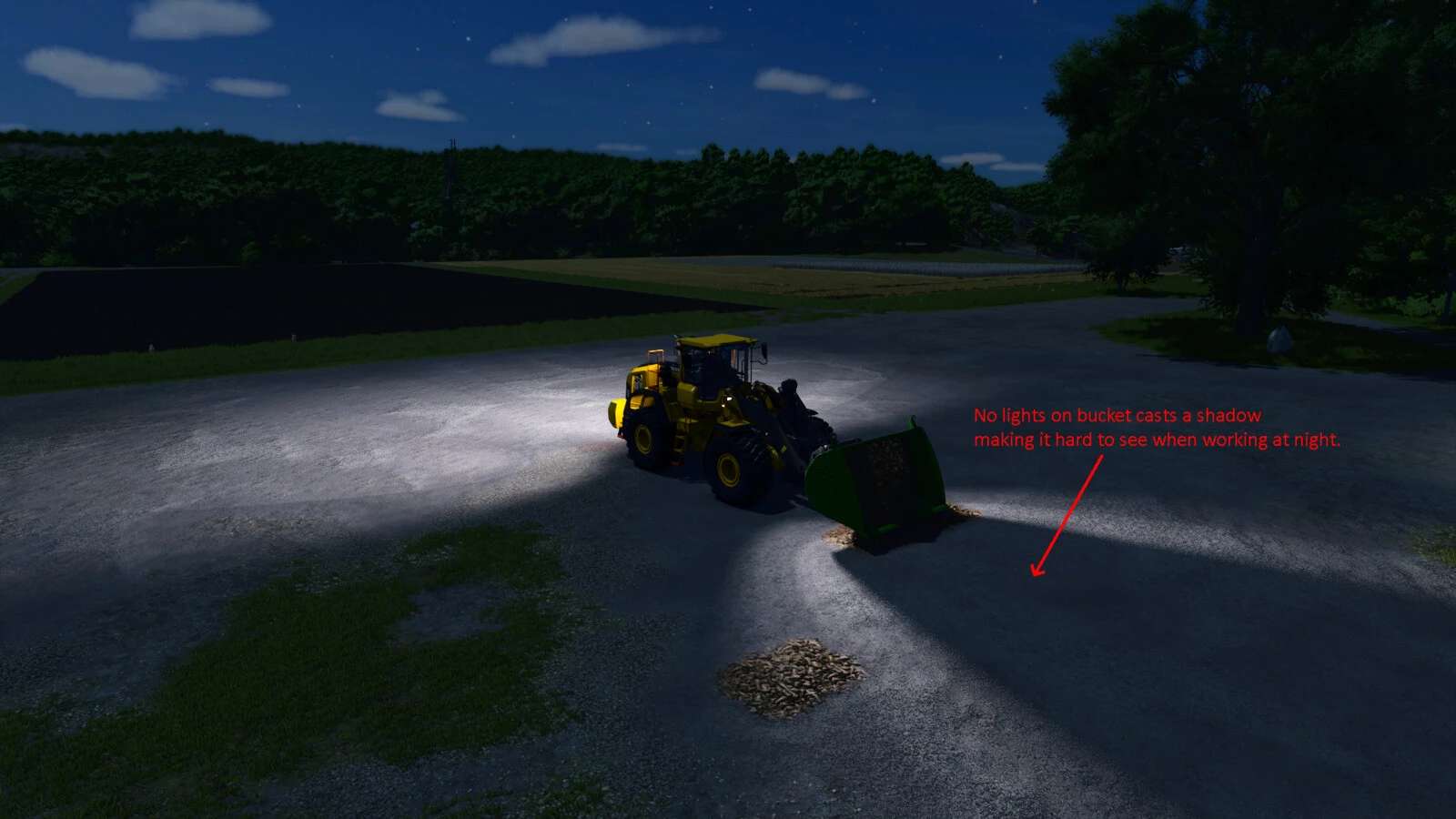 – Work lights on the bucket to make loading in the dark esier without the bucket casting unwanted shadows.